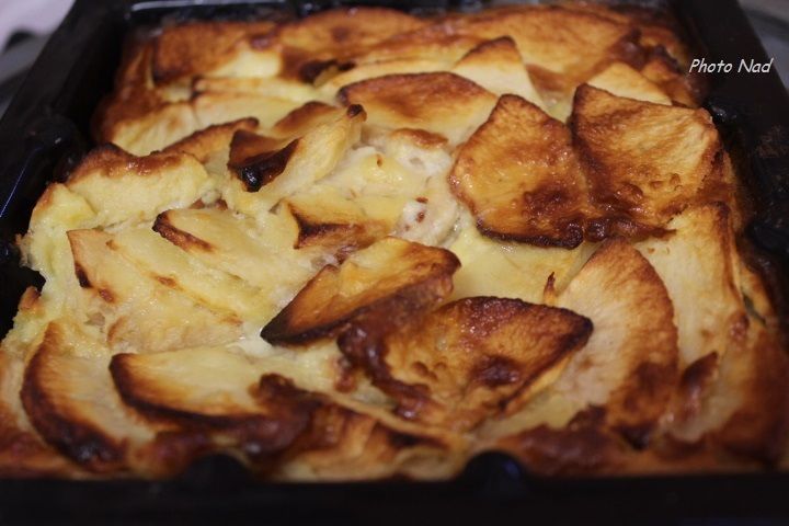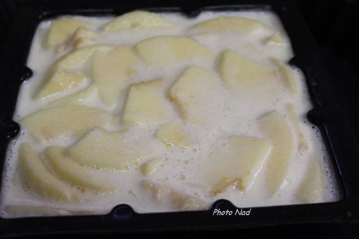 Mouiller un moule en silicone (ça empêche que la préparation ne colle en fin de cuisson) et verser la préparation avec les pommes. (J'ai utilisé le mini moule-tablette de Guy Demarle)